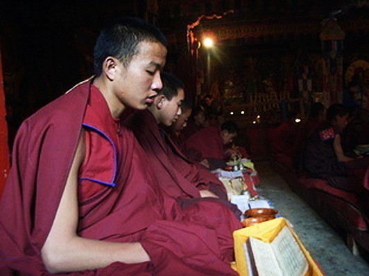 勤行中のサキャ寺の若い僧たち(撮影:福島香織)