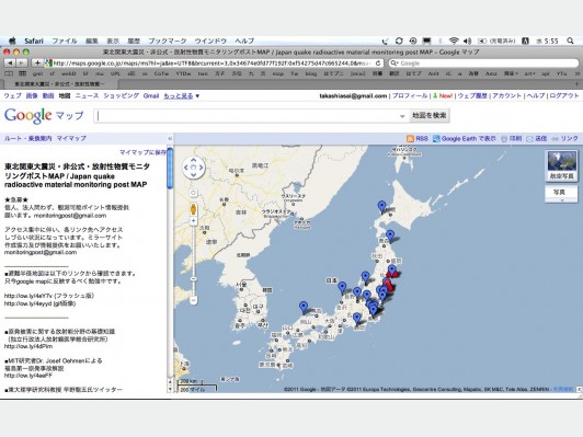 グーグル・マップ上に放射性物質をモニタリングしているところを表示し、そこの場所をクリックすると数値がリアルタイムで表示されるというページがMICRO FILMという会社によって作成されている。