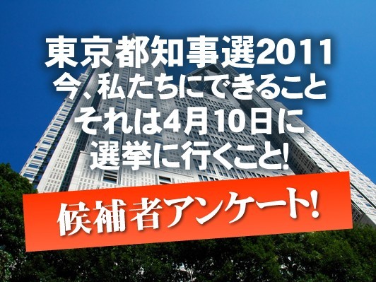 第17回統一地方選挙の一環として2011年4月10日に行われる東京都知事選挙に向けて、webDICE編集部では立候補者全11名に政策アンケートを試みた。催促をしても期日までに回答がなかった姫治けんじ候補を除く10名から回答を得た。