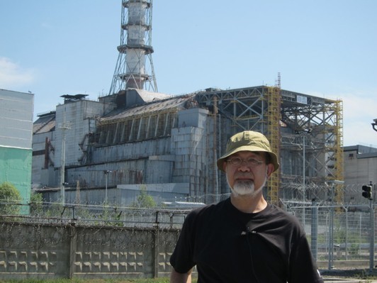 1986年に爆発したチェルノブイリ原子力発電所4号炉まで300メートルの地点で撮影。 2010年7月、放射線量は毎時18マイクロシーベルト。事故後24年経っても、放射能はいまだに高い。(写真提供:鎌田實氏)